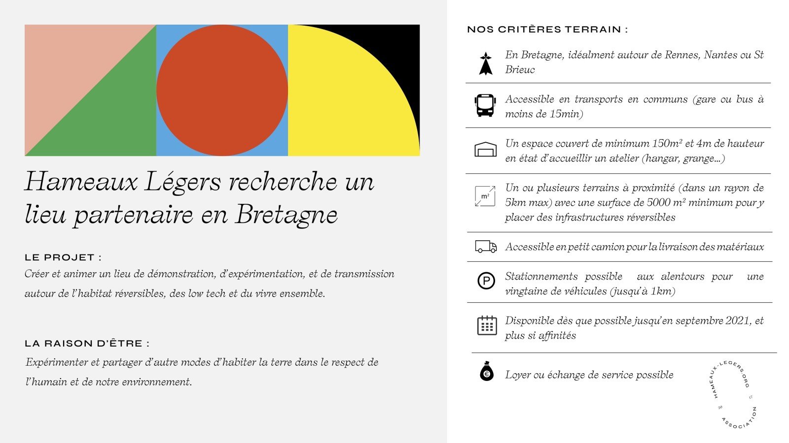 - Un terrain d’au moins 5000m2 sur place ou à proximité immédiate (2km max) pour accueillir notre bureau nomade, des habitats réversibles (tiny houses, yourtes) et des low tech.