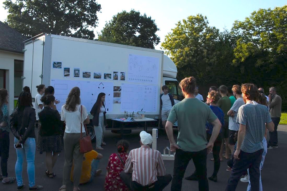La même semaine, les deux habitats légers enfin terminés sont démontés et transportés de Nantes à Saint-André des Eaux pour y être stockés jusqu'au moment du montage sur le terrain communal. L'occasion pour les étudiant·e·s de présenter leurs prototypes pionniers aux habitant·e·s de la commune, heureux·ses de voir le projet se concrétiser sous leurs yeux.