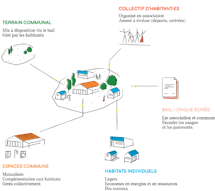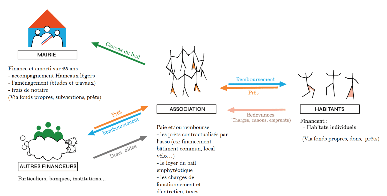 C’est l’association d’habitants qui sera titulaire du bail emphytéotique. Ensuite il pourra y avoir une sous location de l’association à chaque foyer, mais pas nécessairement. Cela dépend des besoins de chaque groupe (transmission en cas de décès, divorce, etc). Hameaux Légers a travaillé avec un notaire et une juriste pour établir les différents cas possibles et accompagnera le collectif à définir ses besoins puis travaillera avec un notaire / une juriste pour réaliser le montage juridique qui répondra à ces besoins spécifiques. On ne propose pas un modèle à tout le monde car il y a différents besoins. Nous accompagnerons le groupe à se positionner sur ces questions puis un professionnel permettra de mettre en place le cadre qui répondra aux besoins du collectif.