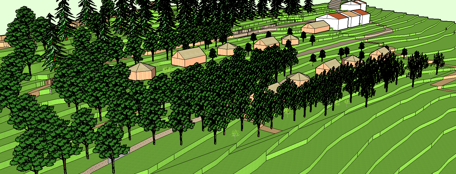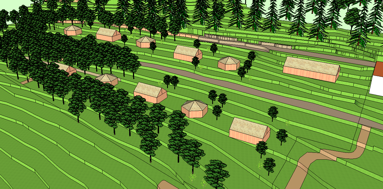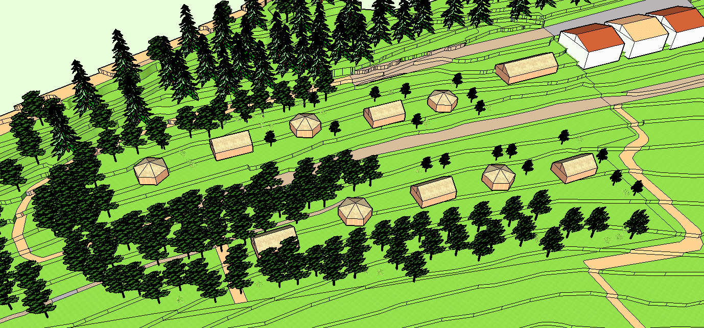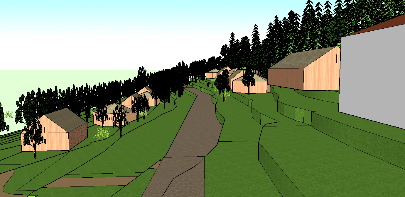 La voie principale traversant le futur hameau d’Est en Ouest semble se positionner naturellement le long des courbes de niveau, desservant chaque habitat et limitant les travaux de terrassement et préservant la végétation en place.