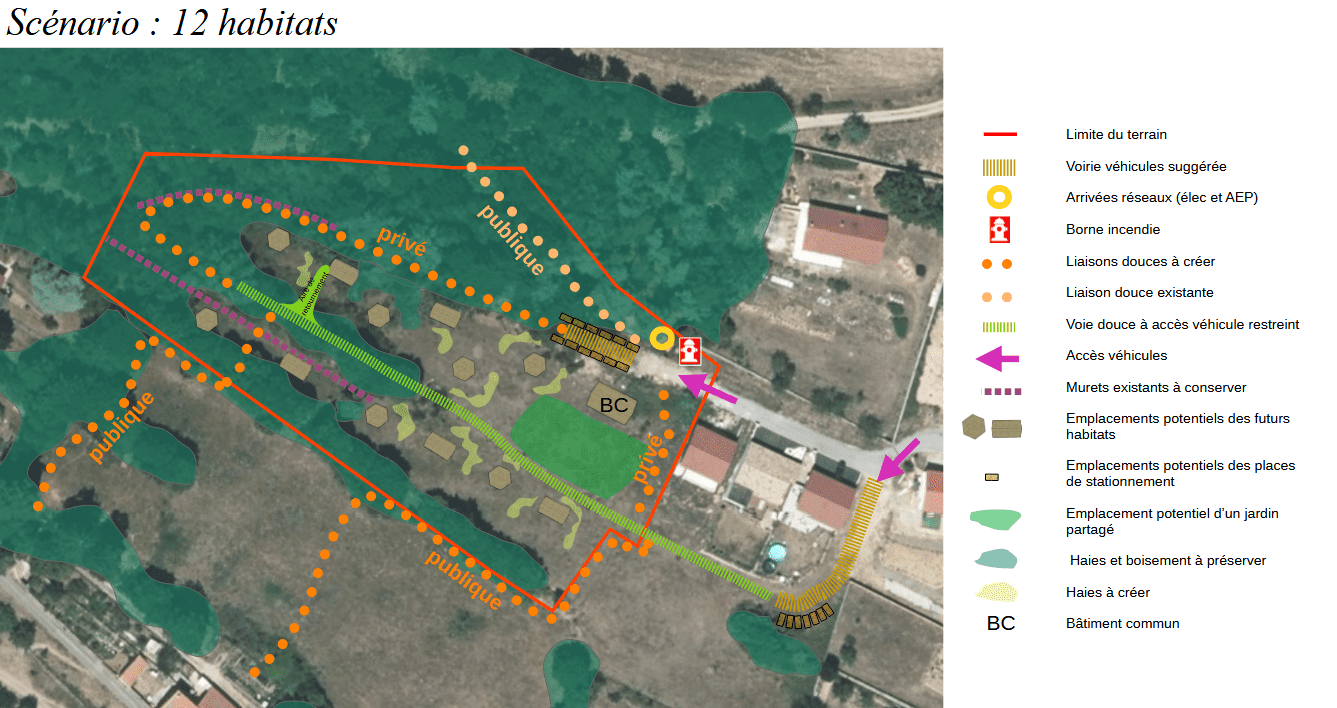 C'est au collectif de définir un plan d'aménagement, avec le soutien d'un architecte-paysagiste missioné par la mairie. Les emplacements peuvent ne pas tous faire la même taille. La partie constructible fait presque 5800m2 et sera divisée à minima en 9 emplacements + des parties communes. De l'intimité peut être créée notamment par de la végétation.