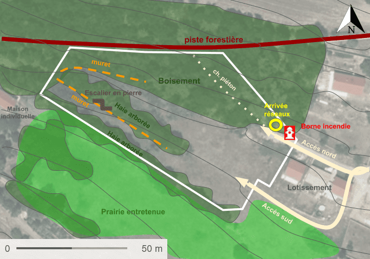 Deux haies arborées dans le sens des lignes de niveaux structurent le site. Elles accompagnent d’anciens murets dans un état médiocre soutenant le terrain. Le terrain est actuellement fortement boisé mais ce boisement sera éclairci afin de redonner du soleil et de la lumière au site ainsi que pour répondre aux obligations préfectorales de protection vis-à-vis du risque incendie.