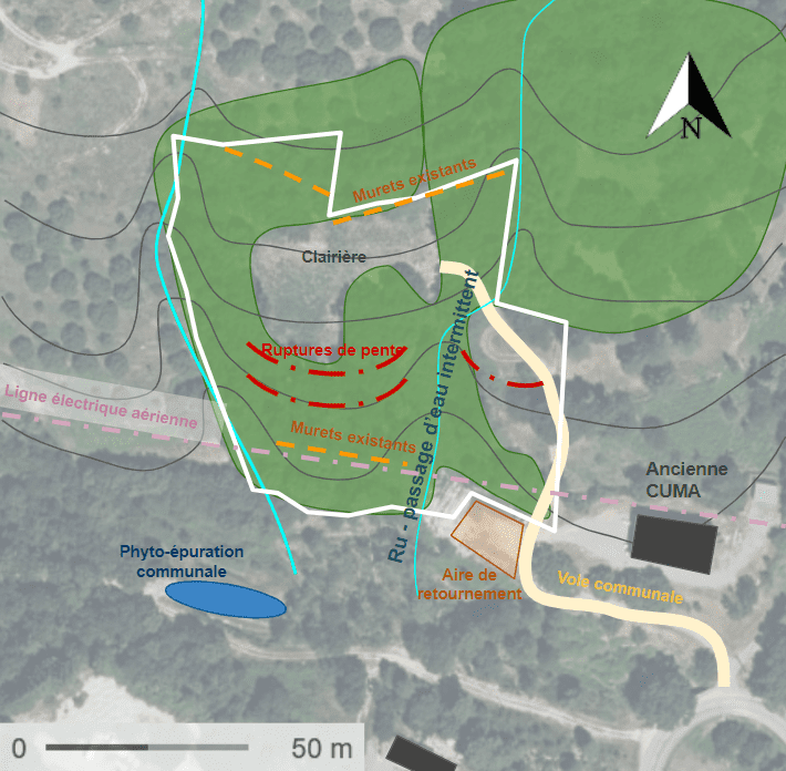 Le terrain présente un dénivélé moyen de 20% exposé plein sud. Ainsi, on peut noter la présence d’anciens murets en pierre sèche servant de délimitation mais aussi pour certains de soutènement.